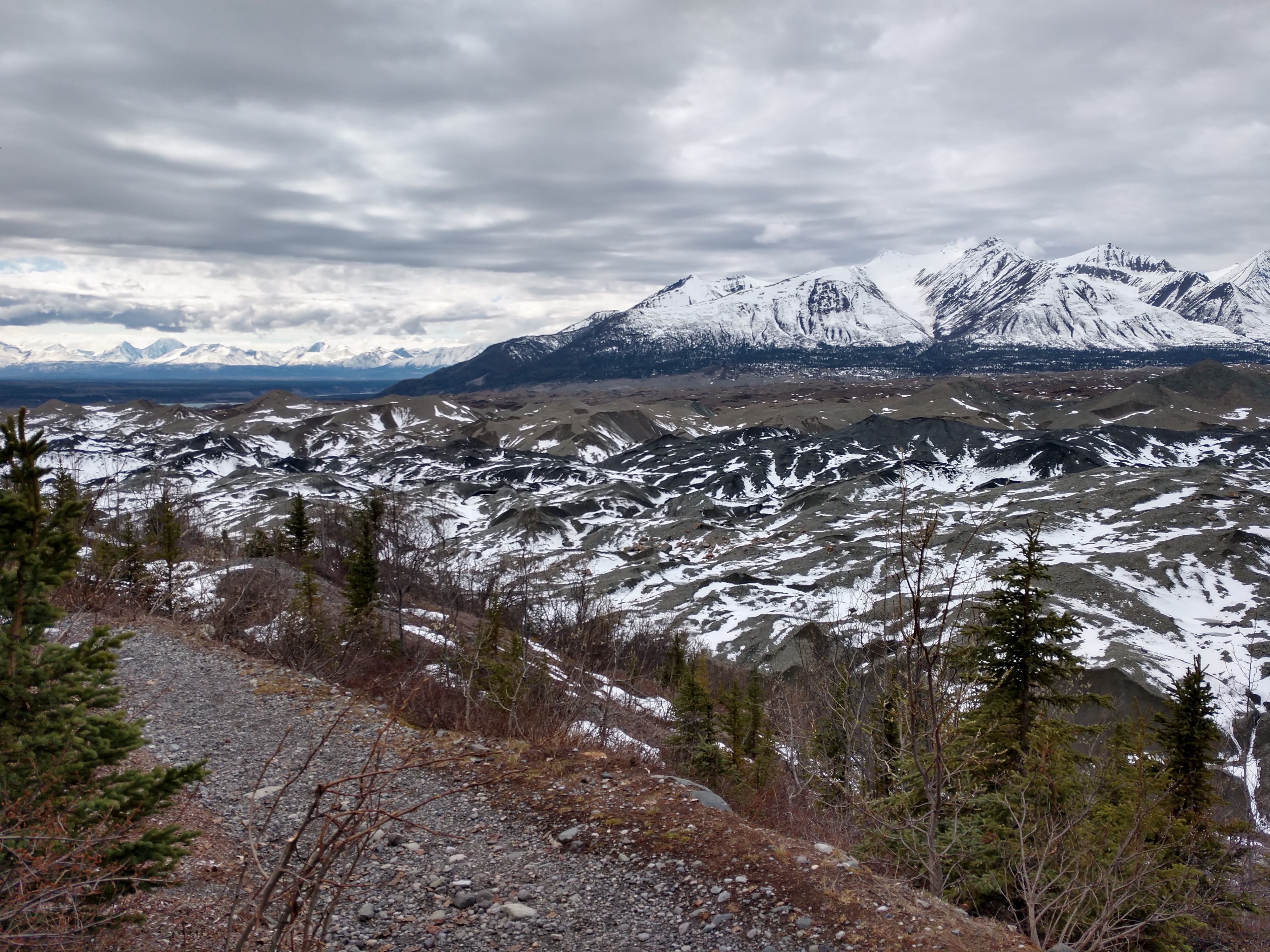 Views on the trail back from Root Glacier -- mountains and Kennecott Glacier.