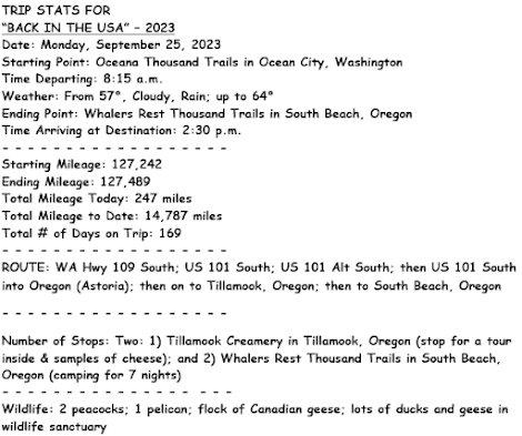We left Ocean City, Washington at 8:15 a.m. and are headed to Whalers Rest Thousand Trails in South Beach, Oregon, which is almost 250 miles away.