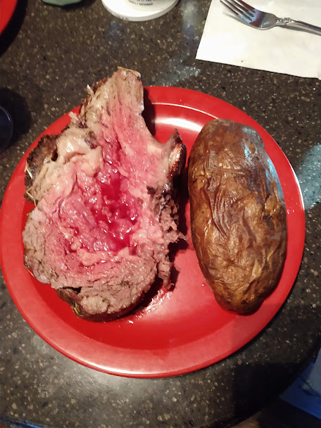 Above is Mel's plate of medium rare prime rib and a baked potato, while below is my plate of the end-cut of prime rib medium well with a baked potato.