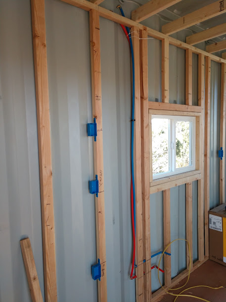 Today, Mel spent most of the day working on electrical wiring and running the red (hot) and blue (cold) pex pipe inside the container.