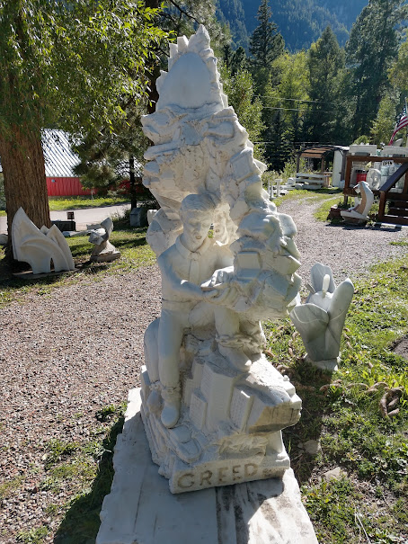 While Mel parked the jeep at the Marble Fire Station to air up the tire, I went walking around the town. Shown above and below are some of the many art pieces carved from the marble.